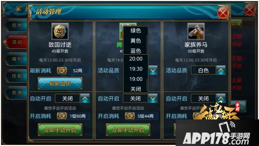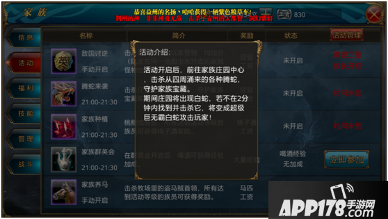 2,族长可以在家族活动管理界面中界面中设置这个活动开启的时间和难度,难度越大,获得的奖励越好。