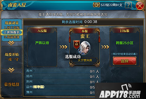 【1】选服报名期间蛮王可通过战争面板的 “南蛮入侵”按钮,或者社会-王权-南蛮入侵打开选服面板选择将要入侵的目标服务器。尽快选服,不然有可能被其他服务器的蛮王选完导致本服南蛮轮空;