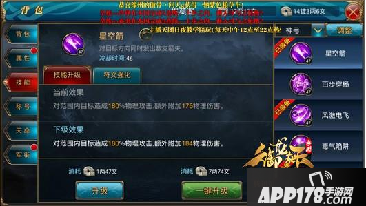 由于狂骨增加附加伤害,则应优先强化星空箭、风激电飞、等伤害较高的技能,而天诛技能提升攻击比,因此优先强化攻击比加成较高的毒气陷阱、射手之魂。