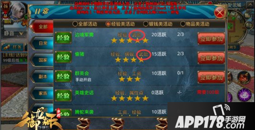 我们打开日常任务面板,就可以看到每当玩家完成一个任务会获取一定的奖励。有的任务会得到经验奖励,有的任务会得到绑银奖励,有的任务则会得到武勋奖励。在日常任务里以下这些任务都会给与或多或少的武勋奖励。它们分别是边境军需、偷猪、斩龙脉、鸡毛信、护国寺偷经、周游列国。这些任务的武勋奖励少则70多则300,如果全部完成还是很可观的。