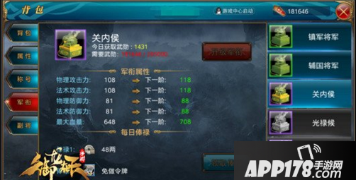 首先,我们点击人物头像,进入属性面板,左侧倒数第二个“军衔”选项。在“军衔”面板里我们可以看到自己今日已获得的武勋,还有当前军衔的属性及下个级别军衔所需的武勋值和属性。在面板右侧是则是军衔列表,最低级别为士卒,最高为汉寿亭侯。军衔到达一定要求时便可手动点击升级军衔,升级军衔可以提升各方面属性,并提高战斗力。而不同的军衔每日俸禄也会根据军衔的高低而提供数量不同的绑银和免做令牌。