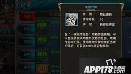 首先打开日常面板,在界面下方可以看到一键完成任务,点击即可看到秒任务界面,在这里的任务都是可以用免做令牌立即完成的,需要注意的是任务必须是玩家曾经完成过并达到一定等级。玩家可以选择需要手动操作的任务一键完成,可以挂机完成的任务就没有必要啦。