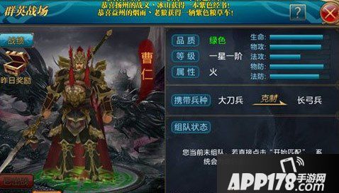 曹仁绿色副将中高生命、高物理攻击以及高防御,适合与霸刀搭配双近程系搭配攻击火爆,其携带兵种大刀兵也属于近战型攻击,主将、副将、小兵强强配合输出更加凶猛。