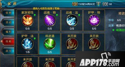 首先来说家族技能,目前为止家族技能共有六个,分别可增加你的最大血量、物理攻击、法术攻击、物理防御、法术防御和喝酒经验。这些技能都是非常实用的,可以增加不少战力。在家族系统-技能面板里,我们可以通过消耗工资来学习与升级家族技能。你要学习的技能等级越高所消耗的家族工资也就越多。