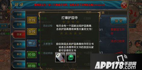 在游戏上方的活动界面中会有打爆护国寺这个任务,玩家只需要接取任务等待游戏指挥发号施令即可。打爆护国寺时间为21:30-22:00持续30分钟,每日高僧会随机出现在一个国家,分别会站在本国护国寺的东南西北。本国玩家需要守护护国寺高僧不被打爆,而敌国玩家则需要在30分钟内打爆任意一个高僧。