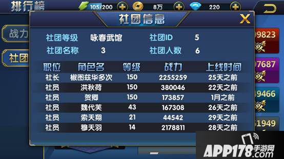 三、社团榜则是统计全服前20名社团总战力最高的社团(社团总战力等于社团所有成员战力之和)。同样在排行榜旁边的人物框只能显示战力是第一名的社团信息。