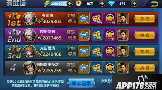 演武场是全服玩家整体战力的排行榜,玩家每天有5次挑战机会。根据玩家的排名为玩家发放的奖励亦不同,每天22点结算通过邮件为每位玩家发放奖励。挑战任何玩家,胜利后皆可获得钻石奖励。战斗过程为自动,玩家在挑战前选择好对手即可。