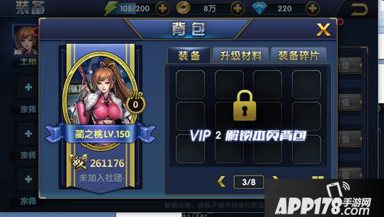 三、装备中的背包是用来存放玩家获得的装备、装备升级材料和装备碎片,在这3个标签页中它们都有8页背包格。它们也都是第1页是免费开放,但是后续7页背包格是根据玩家VIP等级开放的。