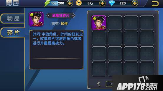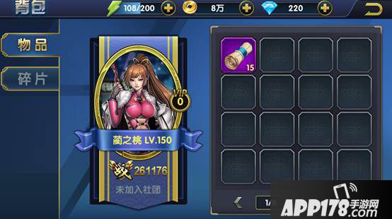 二、主界面的背包是存放游戏各种道具、礼包和主角与宗师碎片的背包,该背包只有物品标签页,有8页背包格。