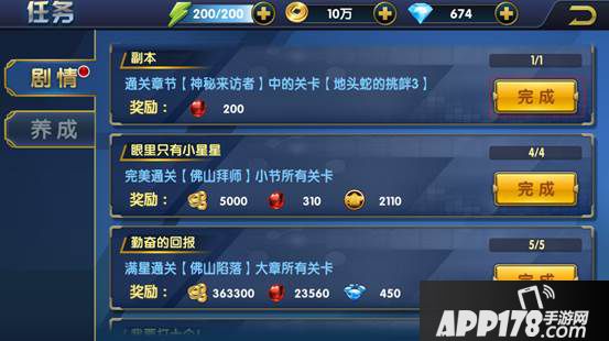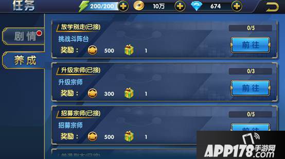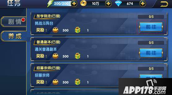 养成任务则是循环任务,玩家每天都可以完成。养成任务的奖励方式与剧情任务,略微不同的是奖励为日常任务宝箱,该宝箱可随机获得:金币、修为、技能经验、体力值、扫荡卷、20钻石和主角碎片。