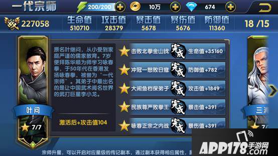 通过培养界面中升星提升宗师星级可以解锁一代宗师中该宗师相对应的传记副本,通过传记副本可以获得相应属性和战力加成。该宗师获得的属性加成根据该宗师等级的提升而提升。