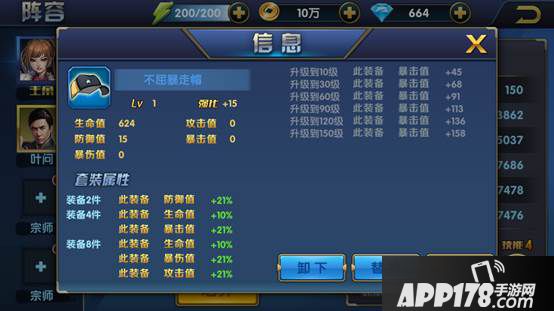 点击已经穿戴上的装备,会弹出该装备信息。在信息界面可以查看该装备属性及套装属性。