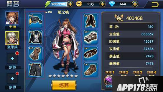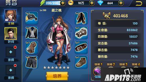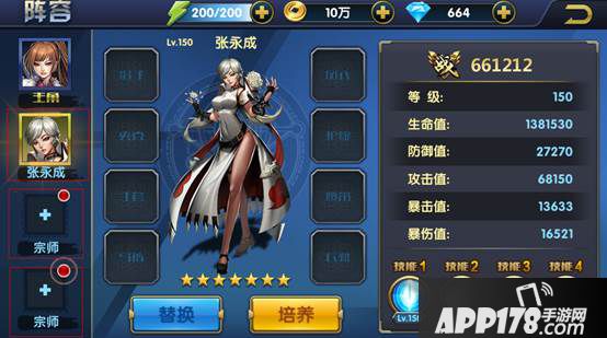 四、在下图红框中我们可以查看主角或宗师单独战力、等级、各项属性、开放的技能和未开放技能解锁条件。