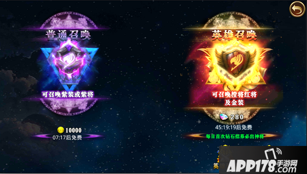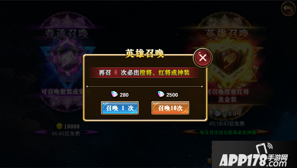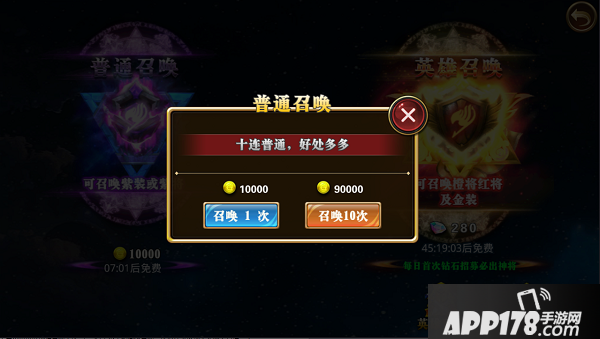 普通召唤:可以召唤出紫色装备或紫色神将,普通玩家每日可以免费召唤5次,每两次之间有10分钟的CD,可以点开召唤预览看看有没有中意的对象哦!也可以选择使用金币连续召唤十次。