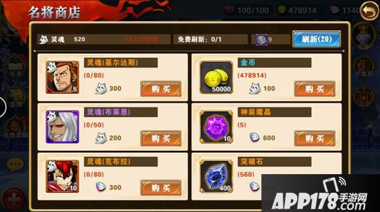 使用“刷新卷轴”可以来刷新商店里的商品,同时每天有一次免费刷新的机会,当遇到想要的角色灵魂时,不要犹豫的使用灵魂或者钻石来购买吧!