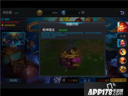 【乾坤借法】被动技。燕赤霞受到致命伤害后,会坐进道神道里恢复,若在6秒内道神道未被打破,则燕赤霞会复活。这个技能是燕赤霞生存力的保障,注意控制好200秒内置CD。