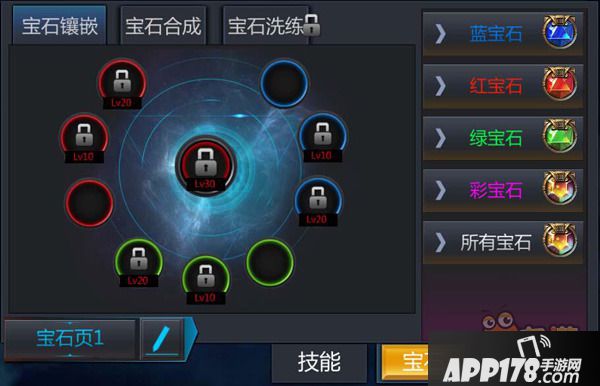 神师可对宝石进行镶嵌、合成、洗练操作;宝石分为四种颜色,每种颜色的宝石具有不同的属性,当神师获得了心仪的宝石组合后,可在游戏开始前的英雄选择页面,为英雄搭配专属的宝石页,增强英雄在游戏中的属性。