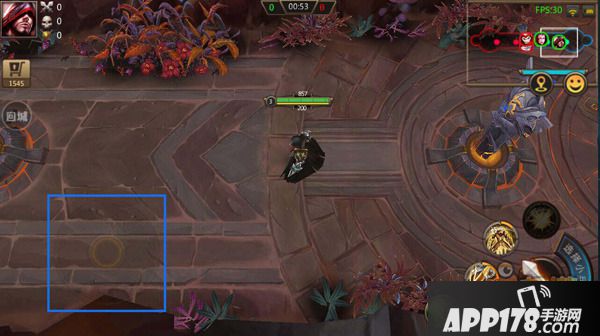 蓝框内区域为虚拟摇杆感应区域;以摇杆所在点为中心,依照触点位置,玩家所控制的英雄会向触点与中心连线的方向移动。(图片为开发中版本截图,仅供参考)