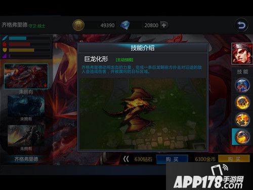技能描述:齐格弗里德动用龙血的力量,变成一条巨龙,并且飞向目标区域,沿途的敌人会受到 250/450+1*额外攻击力点魔法伤害,并被震向他的目标区域。