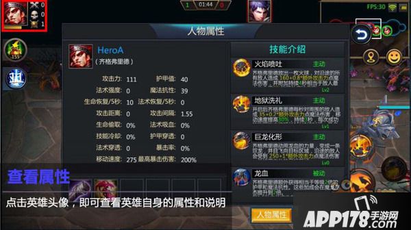 点击英雄头像可以打开人物属性界面。这个界面有当前英雄的属性值、当前装备及当前英雄技能介绍。