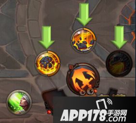 绿色箭头指向的三个是英雄技能,每个英雄都有三个技能,每次升级都可以对任意一个技能升级。技能的释放方式有点击、选中施放和拖拽三种施放方式。