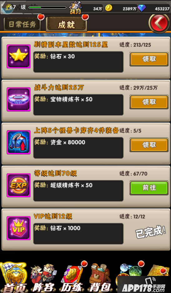 在日常任务旁边,还有成就列表,点击进入可以查看到各种成就的进度,达到要求就可以领取丰富奖励呢!逆袭高帅富就靠他了!