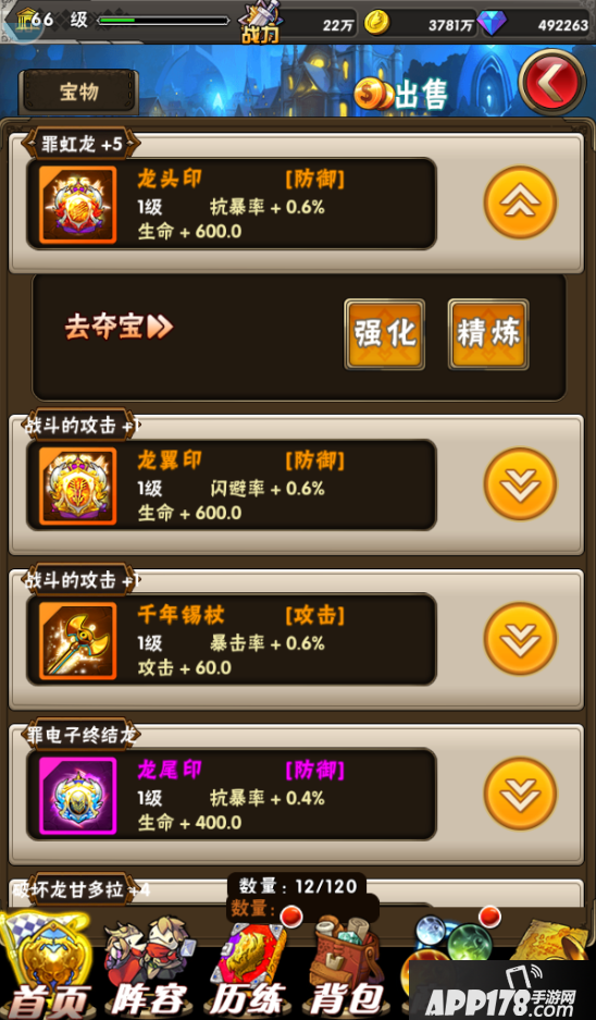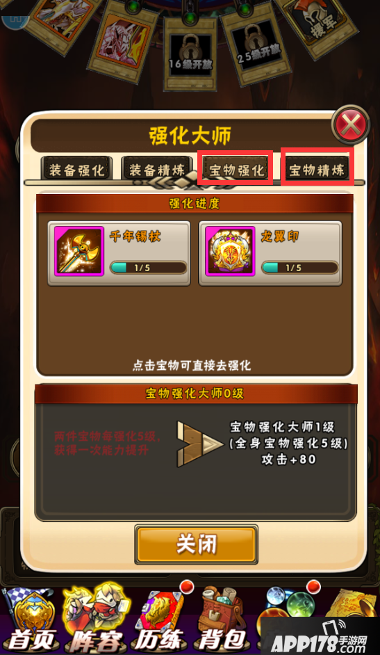 - 从主界面的“阵容”进入怪兽界面下方2侧找到宝物图标,点击宝物图标后进入宝物属性界面,选择“强化”或“精炼”。进入对应界面操作即可。
