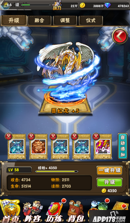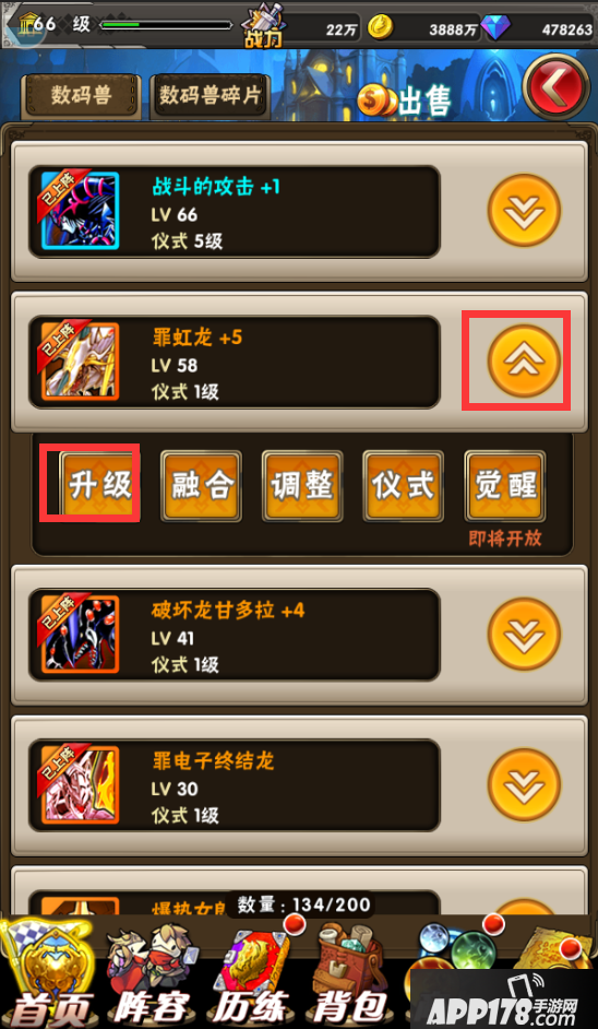 那么怪兽是怎么升级的呢?非常简单,只要通过【阵容】或【怪兽卡】按钮进入能看到怪兽的界面,点击怪兽,就能轻易的找到【升级】按钮。