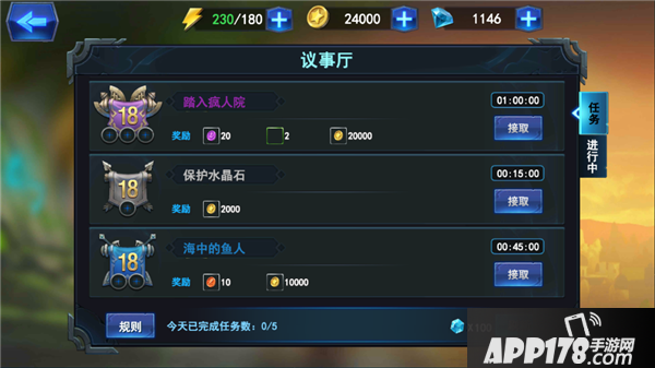 在议事厅中主要产出一些经验药水和金币。玩家22级后开启议事厅,任务会在每天9点和18点自动刷新,也可通过花费钻石手动刷新。任务需派遣英雄前去完成,经过一段时间候可获得奖励。每个英雄同一时间只可执行一个任务。