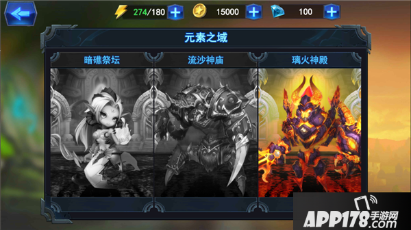 在元素之域中可以产出一些装备和装备碎片。它分有三个副本,分别是:暗礁祭坛、流沙神庙和璃火神殿。每个副本每天均有5次挑战机会;有四个难度开放等级分别是18、30、45和60级。