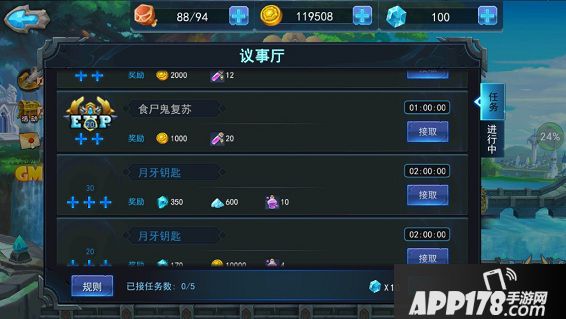 议事厅内的任务每天最多完成数初始为5个,会随着VIP等级的提升而增加。系统会在每天的9点和18点发布任务,玩家可以通过消耗钻石刷新任务。议事厅刚开启时,显示5个任务,会随着玩家等级的提升任务列表中的任务数量也会随之增加,同时任务内容也会有所提升。