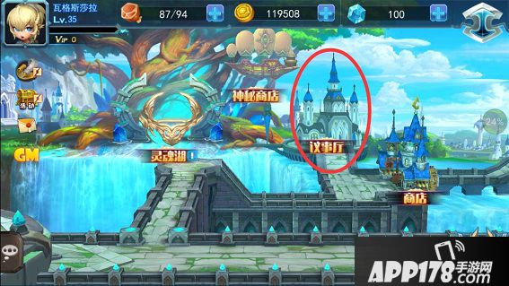 议事厅是一个发布任务的地方,玩家可通过根据任务需求派遣对应的英雄去完成任务,从而获得丰厚的奖励。图中红圈内的建筑即为议事厅。玩家等级达到20级后即开启此功能。