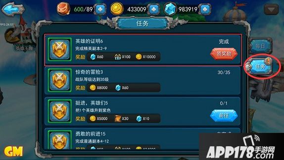 上图画面中红圈内即是任务系统,游戏中任务系统分主线任务和每日任务,完成任务后可获得不同类型的奖励。见图中任务上方标感叹号即为已有完成任务,进入即可领取任务奖励!