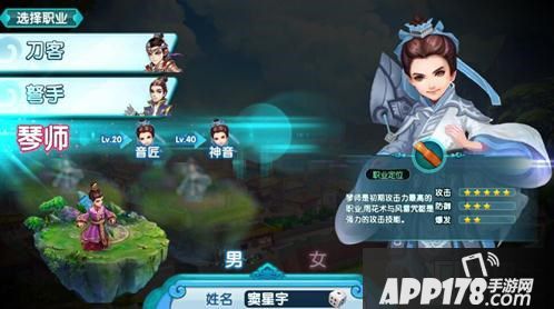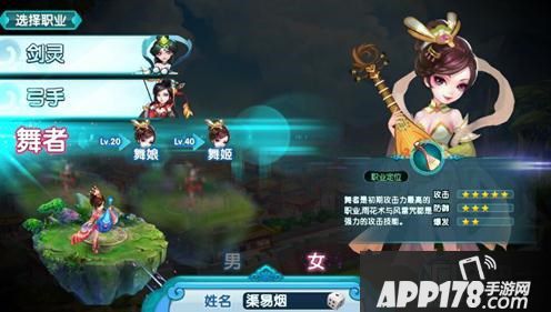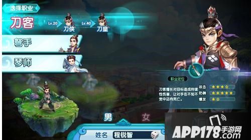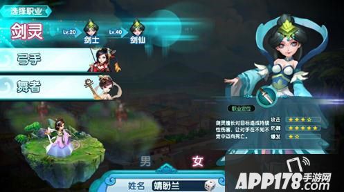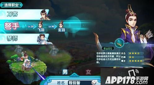 其中,男性角色可选的职业为:刀客、弓手和琴师。而女性角色可选的职业为:剑灵、弩灵、舞者。