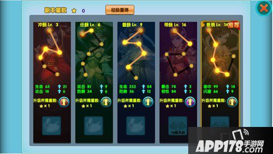 该系统中一共分为5种经脉,分别为冲脉(影响攻击和意志),任脉(影响韧性和生命),督脉(影响内力和暴击),带脉(影响速度和命中),霸体(影响防御和韧性)。升级经脉需要通关英雄本所获得的升星,玩家选择想要升级的经脉进行升级,这可是提升战斗力的好办法哟!