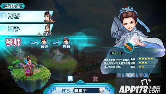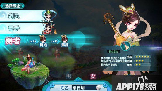 其中,男性角色可选的职业为:刀客、弓手和琴师。而女性角色可选的职业为:剑灵、弩灵、舞者。