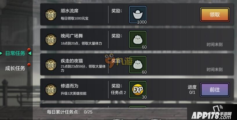 2.成长任务,做了日常任务之后,少不了的就是成长任务,玩家完成成长任务不仅可以升级,同时还能在任务中获取到奖励哦!不同等级完成的任务不同获取到的银两和元宝也会不同。
