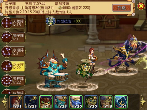 游戏的特色玩法很多,如星座阵法,伙伴系统,融合系统等,这才是这款游戏的亮点。游戏最有创意的地方非“十二星座阵法”莫属,如天蝎阵、水瓶阵、射手阵等等,不同的阵型会有不同的属性加成和站位,玩家可根据攻防策略的考虑选择阵型,游戏最先开启的是天蝎阵和狮子阵,天蝎阵型加成的格挡,而狮子阵加的是物防,随着角色等级的提高,其他阵型会逐步开启。