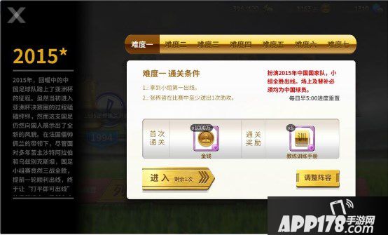 最后来说一说外传。有的外传会对阵容有一些限制,比如2015年的外传就需要玩家扮演中国国家队去征战亚洲杯,既然是中国国家队,那阵容中就只能上阵中国球员啦。这就要求玩家除了自身的常规阵容之外,还要有一套纯粹由本土球员组成,战斗力又不弱的阵容。而2014年的外传则需要玩家扮演北京国安在逆境中奋起直追,而且还要求阵中大将德扬在至少攻进15球。阵中没有德扬怎么办?去转会市场签吧。否则贸然进入外传的话可是会白费功夫的。