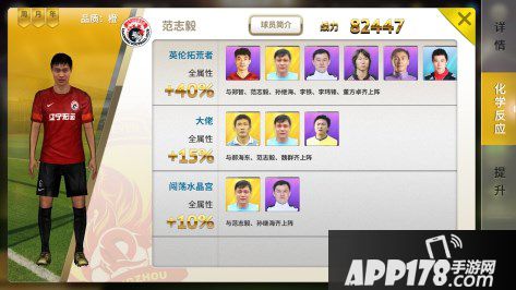 一个完美的球队不但要有强力的11人首发名单,还要有实力强劲的替补球员提高板凳厚度。与现实世界不同的是,在中超风云里,替补球员如果和主力球员有化学反应,是可以直接提升主力球员的能力的哦。组成一个缘分的人越多,激活的加成也就越多哦,最高可以激活6人组成的缘分,可以加成40%的全属性哦,而且最诱人的是不同的缘分获得的加成是可以互相叠加的呢。