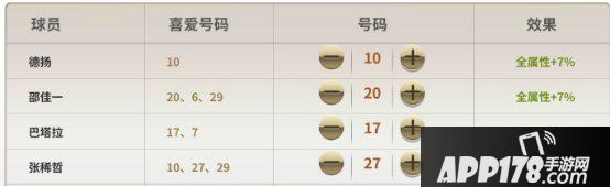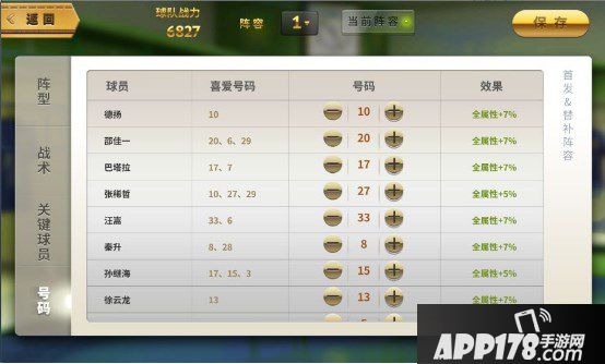 在每一套阵容中,上场球员加替补球员均需要设定球衣号码。号码可以设定为1到99号的任意数字,不能重复哦。每个球员具有属性“喜爱的号码”和“能力加成”,若玩家设定的号码和球员的“喜爱的号码”相同,则球员会享受到“数值加成”。