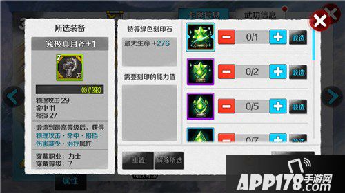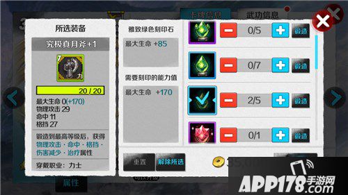 点击装备->刻印,选择需要打上去的刻印石,支付一定金币就可以对装备进行刻印。点重置可以清除装备的所有属性(无金币消耗)