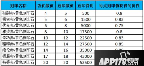 攻击刻印:从图中可以看到【破裂】和【雅致】、【粗】和【奇巧】每点刻印值的攻击是相同的,但是所需金币却少了很多。所以前期推荐使用破裂和粗劣品质的刻印石,把剩余的雅致、奇巧合成更高级的刻印石来使用,这能让你在保证不浪费刻印石的前提下在前中期获得更多的属性加成。