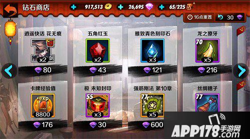 钻石商店会刷出究极物理、气功装备材料,最便宜的价格只需要1钻石的金铸块等,十分优惠必须入手,打造究极装备这类材料十分吃紧需提前做好收购准备。卡牌碎片可以考虑自身需要升心的卡牌来选择购买入手,一些不培养、性价比低级的卡牌不入,钻石不吃紧,可以考虑购买难获得的黑曜石和金刚石用来合成提升卡牌战斗力。到后面可以用钻石购买卡牌升7星必要的印章材料,10个印章价格250钻石,看自己卡牌升星需求量和钻石量来适当入手(非豪需谨慎)