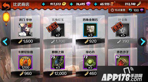 比武商店同钻石商店一样也能刷出的宝石,有时刷出5角宝石,但货币量要求较高1700,看个人所需考虑购买,想升星强化装备的童鞋很吃紧比武碎片和材料时宝石可以先放手不入,剩下一笔货币购买你真正需要的货品。