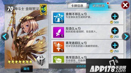 战斗吧剑灵中,金刚罗汉是守护南天国遗迹的古代法器,S级别的资质属性+其力士职业的特性造就了金刚罗汉超高的生命值/防御值,金刚罗汉的武功是给队友产生防护罩,但是值得注意的是金刚罗汉的防护罩是全体,给队伍生成了一个7秒内的铜墙铁壁,坚不可摧!