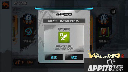 想要获得十连胜还有必不可少的一点,那就是战斗中途的3个增益效果。在第3场、第6场、第9场战斗之后,都会随机获得一个增益状态,这个增益状态可以通过支付金币来重新获得,对于前两个增益状态来说,我们可以根据卡牌体力、内力的情况选择前排战斗卡牌的生命恢复100%,或是所有卡牌的内力提高50%。但是对于最后一个增益状态来说,一定要选择后排战斗卡牌的攻击力提高100%,因为第十场战斗的对手通常都是很强的,这时候只有利用后排卡牌攻击力的提升,在第一时间使用卡牌技能秒掉对手的前排,才能确保获得胜利。