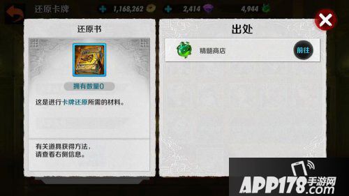 还原书,是还原卡牌玩法中的重要道具。根据被还原卡牌的星级等,需要消耗的还原书数量不等。玩家目前可以通过精髓商店得到还原书。而玩家获取到精髓的途径,有幻魔、连招副本、血战等。其中,连招副本和血战玩法进行了更新,不在是在特定时间出现了,而是采用了CD时间。还原书,玩家可以使用,还原自己不用的高星级和高等级卡牌,并获取到对应收益(单击查看还原卡牌玩法介绍)。