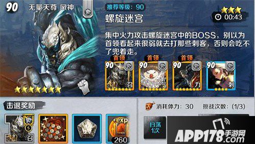 螺旋迷宫副本属于据点BOSS副本,进入需要消耗30点体力,和之前的据点副本一样,只有一关并且有后备有强力BOSS卡牌,首先出场的是力士BOSS 全体攻击模式,站1号位置,后备分别是雷神(全体回血+反伤)、痞子盗(全体攻击并沉默)风神(全排晕眩攻击减内30),其他2、3、4、5号位置为单体攻击前方的刺客。