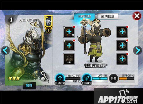 无量天尊雷神,玩家可以通过螺旋迷宫、稀有和高级寻宝、达成度奖励、任务途径获取。无量天尊雷神的武功消耗为50,但是,可以看到,花之反击和极限花之反击的效果极其出色。一旦当雷神发挥出了自己的技能,则对于己方有极大的帮助,同时,对于敌人,有反弹的攻击效果,实属犀利。不过,其获取的途径,还是很高端的。